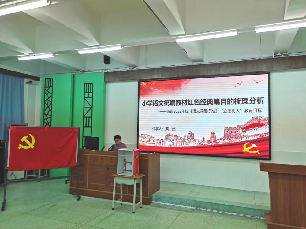 接着,党支部继续开展“党员教师讲党课”的特色活动。宣传委员粟一烜同志分享党课《小学语文统编教材红色经典篇目的梳理分析——兼谈2022年版<语文课程标准>“立德树人”教育目标》,介绍了统编教材红色经典篇目的选编意义和选编思路,对统编教材红色经典篇目进行统计分析和讲解,立足于红色文本中的“人”、“物”、“事”的描绘叙述进而弘扬传承其“魂”——红色精神。中大附小语文校本整合文本秉承统编教材红色经典篇目的选编理念和要求,结合党史教育和2022年新课程标准,对部编教材进行有效补充,基本构建了完整的红色基因教育体系,体现中大附小语文学科课程的“整合”理念,夯实语文学科承载着红色基因传承的教育目标,落实“立德树人”的根本任务。