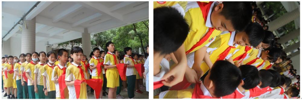 激动人心的时刻终于来临,大队辅导员宣读新队员名单。伴随着歌曲,老队员代表们为新队员佩戴上了鲜艳的红领巾。从佩戴上红领巾的这一刻起,他们便成为了少先队组织中的一员,成为了为共产主义事业的接班人。铭刻队训,遵守队章,将成为他们的义务和使命。
