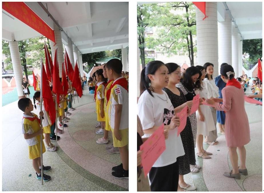 一年级八个中队被授予中队旗,星星火炬传递梦想,相信队员们一定能在队旗的指引下乘风破浪,勇往直前。张校长向中队辅导员颁发聘书,接受聘书的辅导员们,意气风发,志当少先队员们的指引者,也做队员们的知心大朋友。