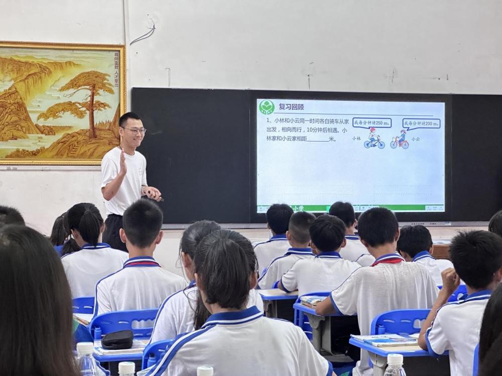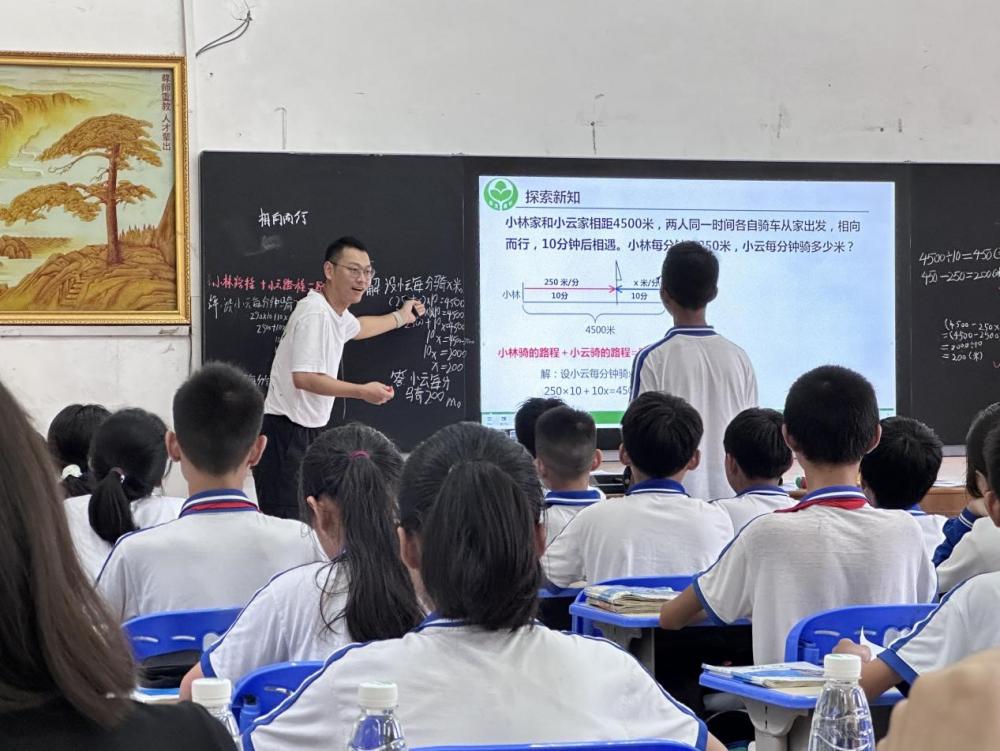 首先,我校数学科组李振彪老师执教了人教版五年级上册《用方程解决行程问题》 一课。李老师充分考虑学生已有的知识经验,十分关注学生的实际情况,设置了精彩的热身游戏环节。课堂上,李老师主要是通过用方程去解决行程问题,同时还联系学生在小学阶段接触过的“单价、数量与总价问题”“工程问题”以及“鸡兔同笼”问题,加深了学生对于“用方程解决问题”的理解。在教学过程中,李老师鼓励学生一题多解,通过例题改编、方法对比、建立模型等方式,培养孩子们解决问题的策略和建立模型的意识。