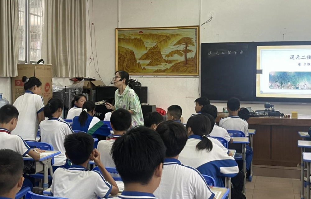 紧接着,我校语文科组邹佳林老师执教了人教版六年级下册古诗词诵读之《送元二使安西》一课。邹老师的教学打破了传统古诗词教学固有的模式,更加注重引领学生感受诗歌的意境,课堂层次分明,学生在朗读、想象、感悟中真正走进诗歌。在教学时,邹老师特别关注到六年级语文教学的学段特点,加入了送别诗及诗歌意象的梳理,通过“关注注释”“结合插图”“联系生活实际”等方法,引导学生调动感官,为诗歌意境的想象提供支架,让学生想之有法,想之有物。此外,通过“拓展边塞诗歌”“借助资料”等方式,重现“阳关之路”的艰辛与漫长,使得学生对诗人复杂的心境理解也更加深刻。