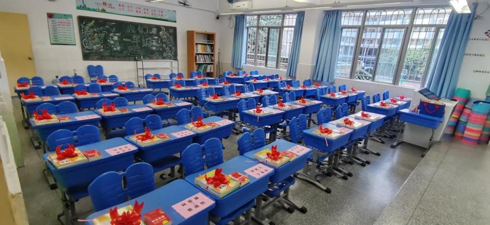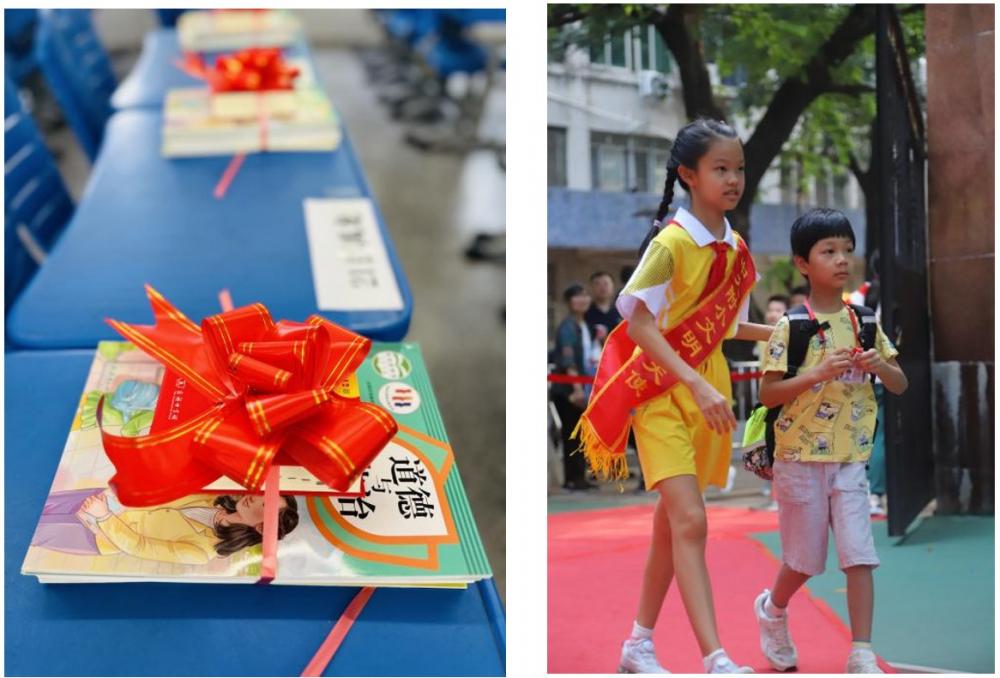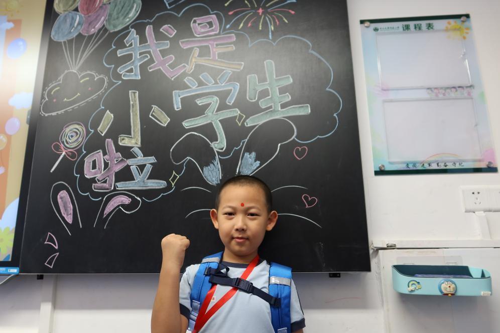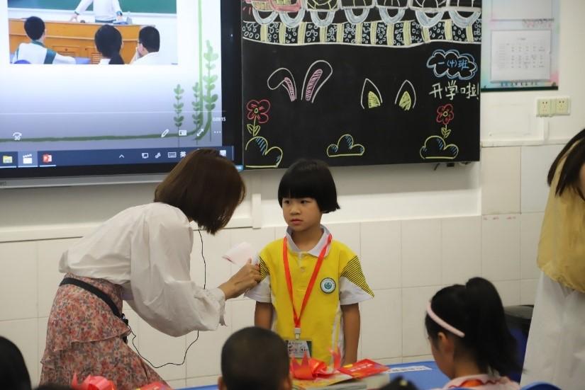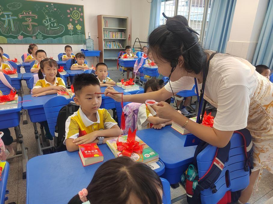 一年级新生入校后,老师捧起一张张稚嫩的脸庞,轻点朱砂,为新同学的额头点下红痣,祝愿他们智慧之门开启,享受小学生活。