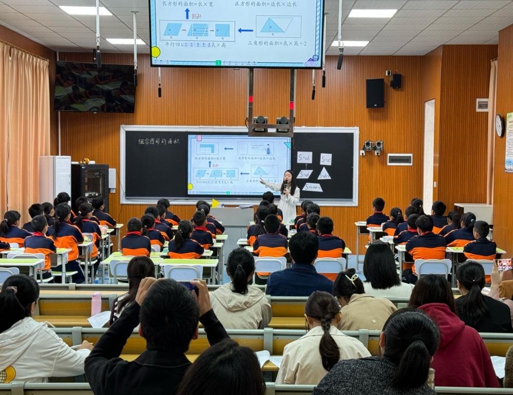 数学学科李色桂老师对人教版教科书五年级上册第六单元《多边形的面积》第97页“组合图形的面积”进行了课例展示,她整合了苏教版、北师大版、沪教版等课本的相关内容。课堂通过创设丰富的生活情境,把学生带入到他们所熟悉的教学情境之中,为学生提供自主探索的时间,让学生根据自己的生活体验和经验用自己的思维方式去探索发现、解决问题。并根据组合图形的特点,引导学生灵活选择分割、添补、割补等方法正确计算组合图形的面积,积累组合图形的面积的转化经验,感受转化思想。