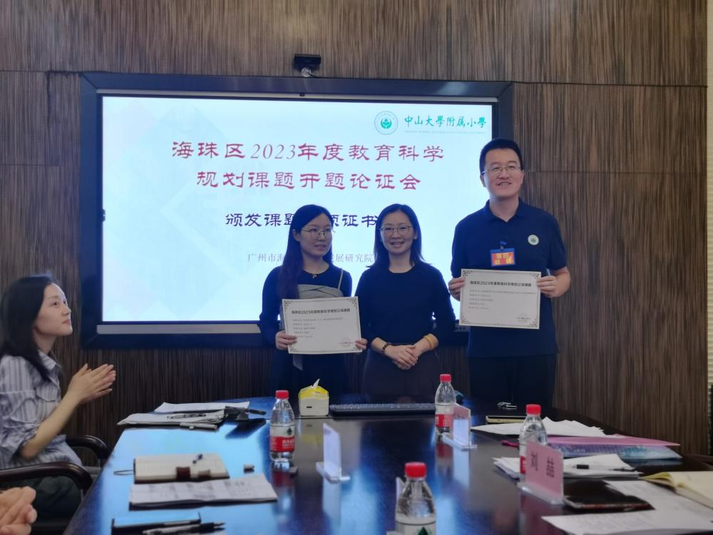 会上,叶海萍老师首先代表海珠区教育发展研究院科研部对课题成功立项表示祝贺,接着她宣读了立项通知,并向两位课题负责人颁发课题立项证书。
