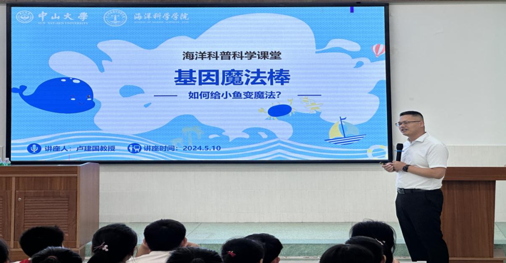 在阳光明媚的周五下午,中山大学附属小学迎来了一场别开生面的科普盛宴。中山大学海洋科学学院的卢建国教授走进附小的科学讲堂,为四年级的孩子们带来了一场题为“基因‘魔法棒’——如何给小鱼变魔法”的精彩讲座,给孩子们开启了一场奇妙的生命科学之旅,让复杂的生物学知识化身为触手可及的奇幻故事,激发了学生们对生命科学的无限好奇与探索欲。