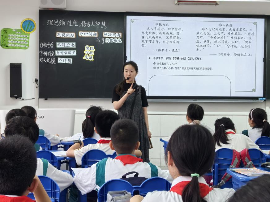 孟帆老师执教《自相矛盾》,紧扣“思辨性阅读与表达”学习任务群的“思辨性”,引导学生借助思维“三只眼”分析人物的思维过程,站在文中“楚人”“买家”“作者”角度上辩证思考,最终明白“弗能应也”的原因。