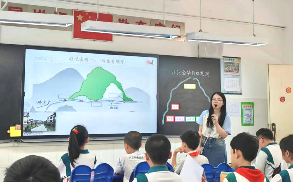 印文卉与俞吉琪老师分别执教《海上日出》《记金华的双龙洞》,立足新课标构建了“大任务联动,小任务驱动”的任务群来组织教学内容,以情境任务“制作游记宣传小册”为教学支架,为学生搭建了从学习者到创作者的桥梁,灵活地将课本知识转化为生动游记。课堂紧扣教学重点,以读促写,体会情感,在师生的互动当中自然生成,准确地落实了本单元的教学目标。
