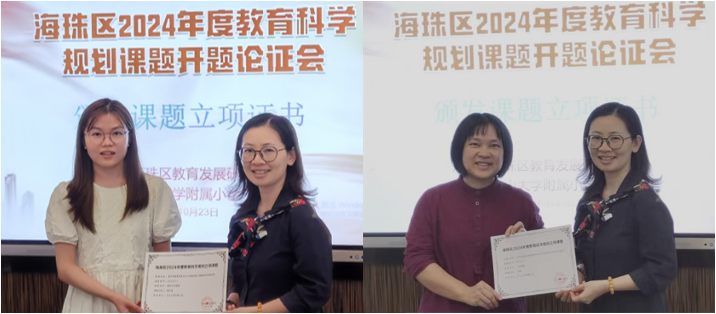 会上,海珠区教育发展研究院科研部科研员叶海萍老师首先代表海珠区教育发展研究院科研部对课题成功立项表示祝贺,接着她宣读了立项通知,并向两位课题负责人李翠老师、曹吉葵老师颁发课题立项证书。