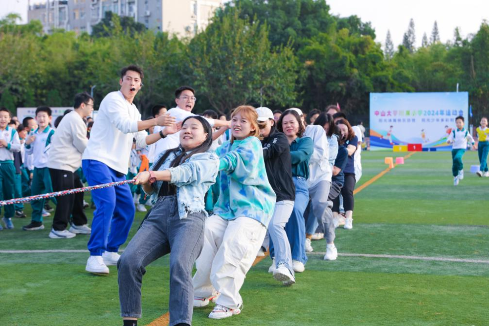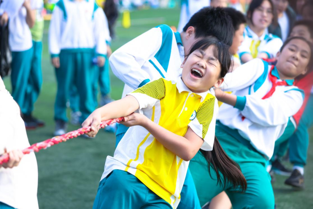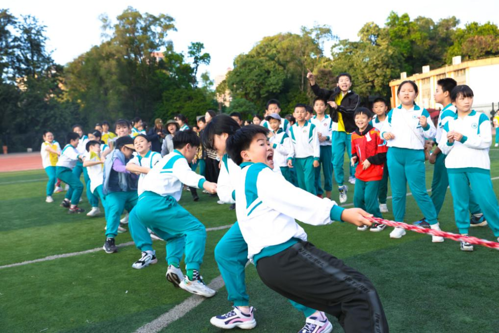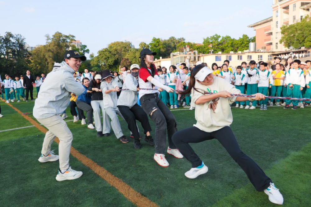 随着最后一声哨响,教师拔河比赛拉开了帷幕,赛场顿时沸腾起来。孩子们们纷纷站起身,握紧拳头、挥舞小手,为自己的老师加油,整齐的口号声响彻云霄,回荡在整个西大球场上。教师拔河赛将本次运动会推向高潮,师生间的互动与情感留下了最温馨、最难忘的记忆。