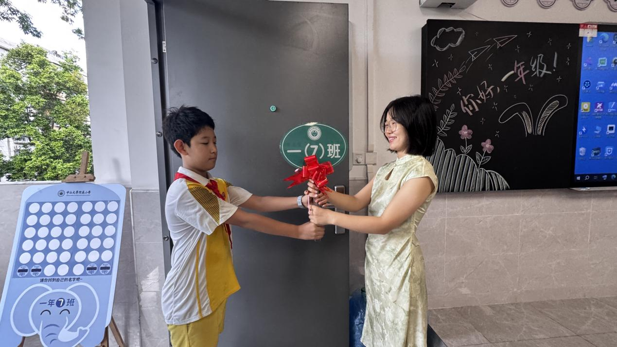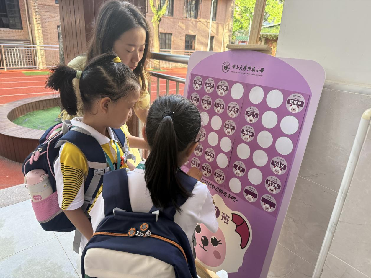 最让一年级新生惊喜的是班级姓名画板,像是在迎接小主人的到来。印着可爱图案的新生姓名贴,成了孩子们融入新集体的“小信物”。