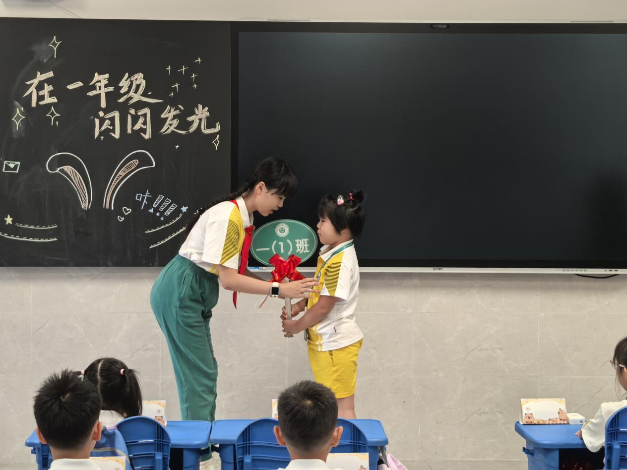 随后的一年级送班牌仪式更是充满仪式感,大队委的哥哥姐姐们双手捧着崭新的班牌,郑重地交到一年级班主任手中,这不仅是班级的标识,更是责任与梦想的传承。