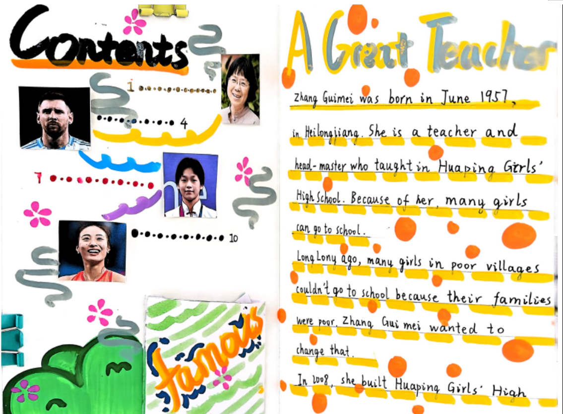 六年级围绕“人物探究,综合运用”主题,结合课程内容开展 “Special People” 英语实践活动。书面创作环节,同学们自主选定探究对象,以英文海报或迷你绘本为载体,用彩笔书写谚语、绘制插画,将人物事迹、品质特点等细节融入作品。主题鲜明、创意十足,实现了英语知识与艺术审美的完美融合。口语展示环节,各小组携带精美 PPT、特色头饰及道具自信登场,或生动讲述人物故事,或模拟趣味对话,流利的表达与生动的演绎赢得阵阵掌声。随后介绍小组的现场即兴应答,进一步增强了英语交际的真实感。