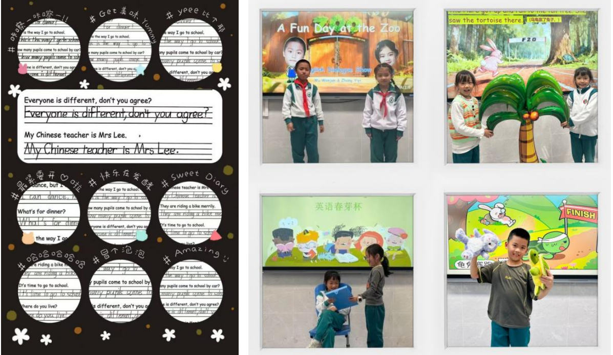 四年级聚焦“学科融合・创意表达”,让英语学习与生活实践、多元学科有机衔接。书面创作中,学生借助数学饼图、条形图等图表,将“MyIdealSpareTime”从抽象愿景转化为立体生动的图文故事,尽显学科融合的独特魅力;“英语聚光灯”口语活动中,学子们自愿登台,围绕餐桌礼仪、兴趣爱好、饮食差异开展主题演讲,或选择课本与绘本故事进行情景表演,语音语调抑扬顿挫,道具灵动鲜活,展现了在全英课堂浸润下的自信表达。